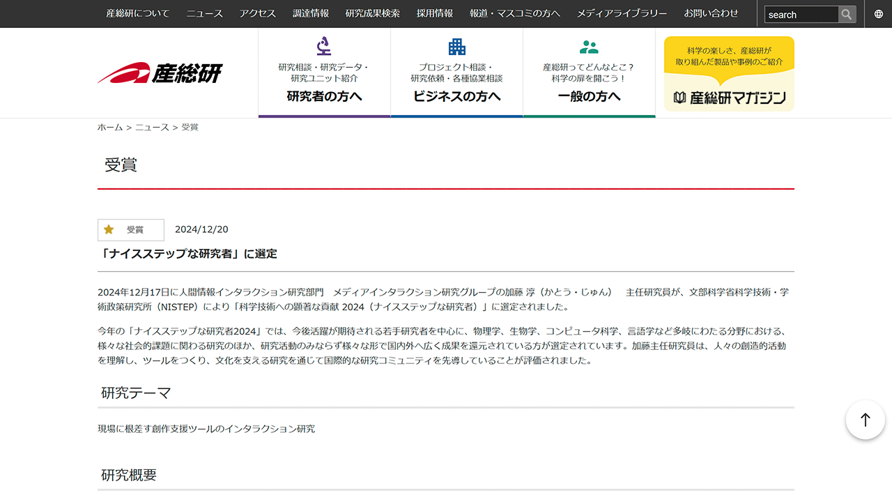 そして、2025 年 12 月 22 日、NISTEP の刊行している「STI Horizon」誌 Vol.11, No.04 にて、Part.6:(ナイスステップな研究者から見た変化の新潮流)ナイスステップな研究者 2024 の御紹介(2)と題する記事が掲載され、研究活動を紹介いただきました。受賞以来いろいろなイベントがあったのですが、おそらく最後の一区切りかと思います。校正は入れていただいていますが、文責は私にあります。Web で全文読めて便利でよいですね。