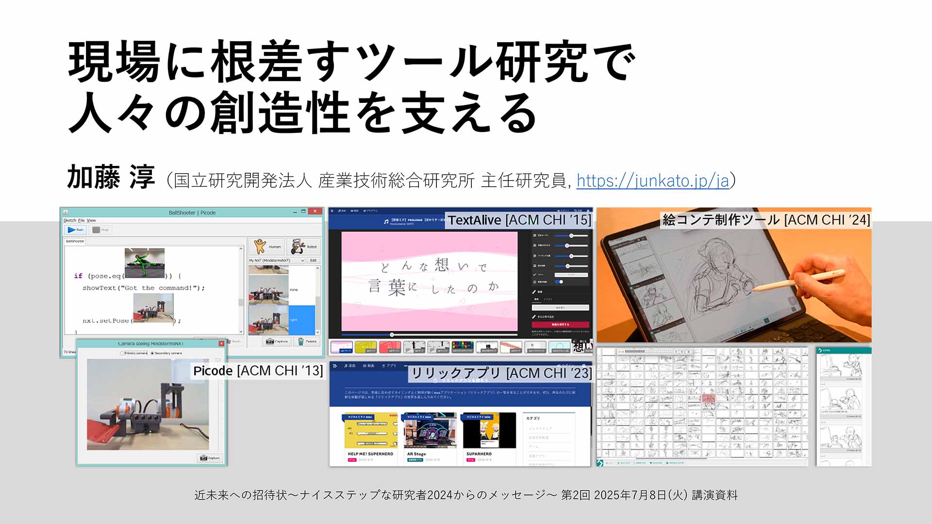 内容はナイスステップの講演にJapan ACM SIGCHI Chapter 受賞講演(ブログ記事)と日本ソフトウェア科学会 基調講演(ブログ記事)を足して三で割ってギュっとしたような感じで、立花隆ゼミ時代のことと、「顕著な貢献」に認めていただいた「道具鍛冶研究者」としての研究ハイライト、その背景として研究の「一般性」に関して触れています。