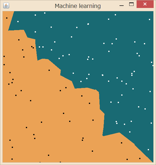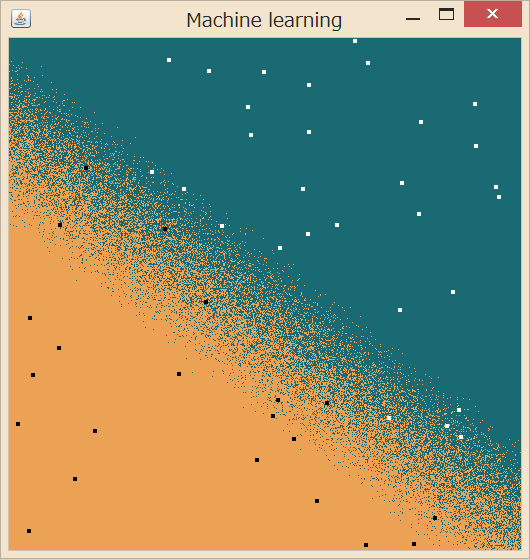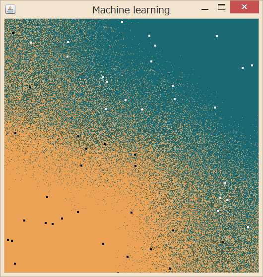 例えば、該当箇所をこのように書き換えれば SVM での機械学習ができます。k-Nearest よりも線引きがはっきりするアルゴリズムなので、実際、分布がはっきり分かれていますね。また、学習サンプルの個数があまり多くないので、線引きの傾きが ground truth と比べるとときどきズレるのも確認できました。