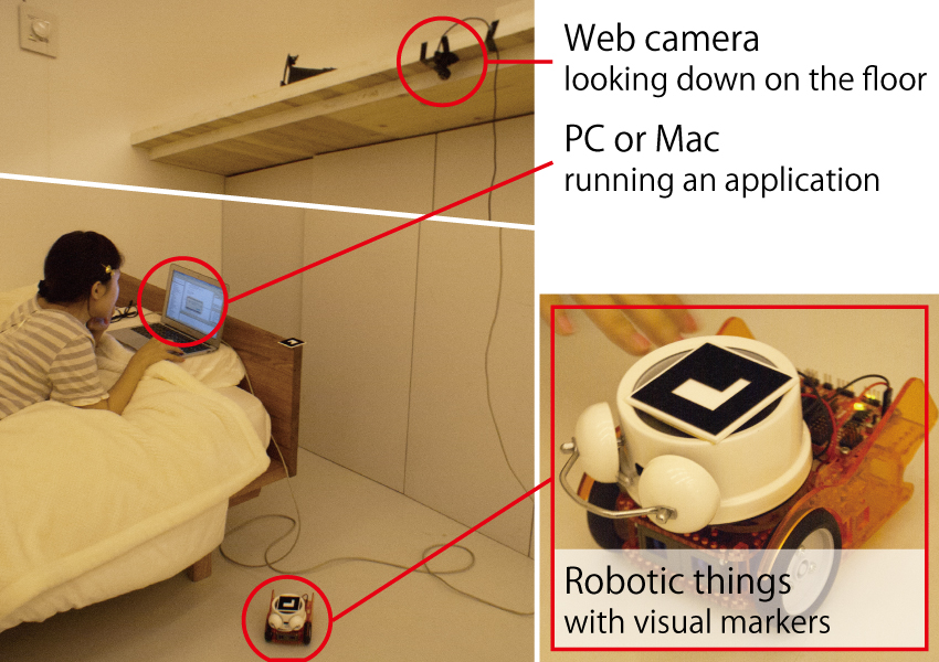 Phybots は、右上の写真のようなセットアップで使われることを想定したツールキットです。床や机の上を見下ろすカメラと、ARToolKit マーカーをつけた小型ロボットを、PC や Mac に接続して、ロボットを好きな場所に移動させたり、物を押させたりできます。作例は YouTube のプレイリストPhybots Applicationsに載っています。