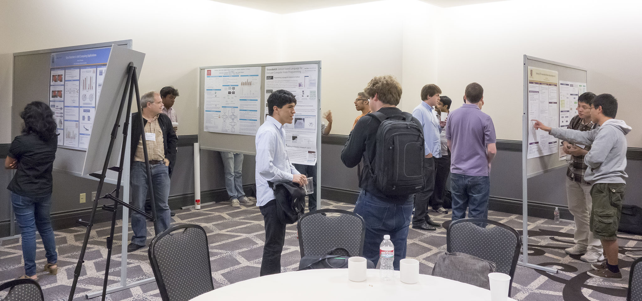 SRC 参加者の全ポスター発表を回り終えると、ちょっと離れた場所ですぐに審査が始まります。CHI、PLDI とも声が聞こえそうで聞こえないくらいの距離にあるテーブルで議論をしていたように記憶しています。発表した側としては気が気ではありませんが、一般の会議参加者がまだポスターを見にくるので、近くに行くわけにもいかず…もどかしい時間を過ごすことになります。CHI はしばらくしたら結論を伝えにきてくれましたが、PLDI の場合は議論が紛糾したようで、翌日の昼にようやく第 3 ラウンドへ進んだ人が発表されました。