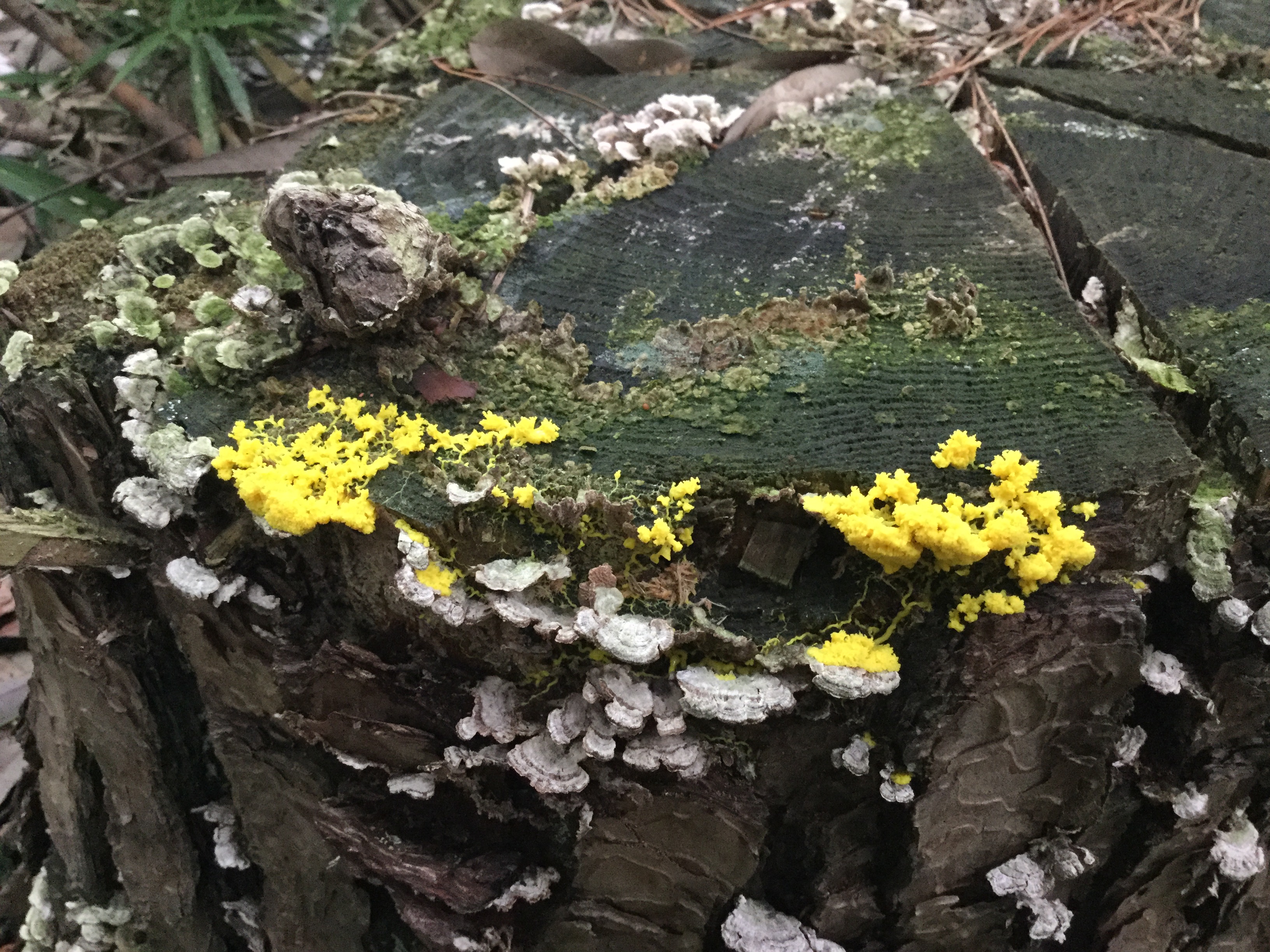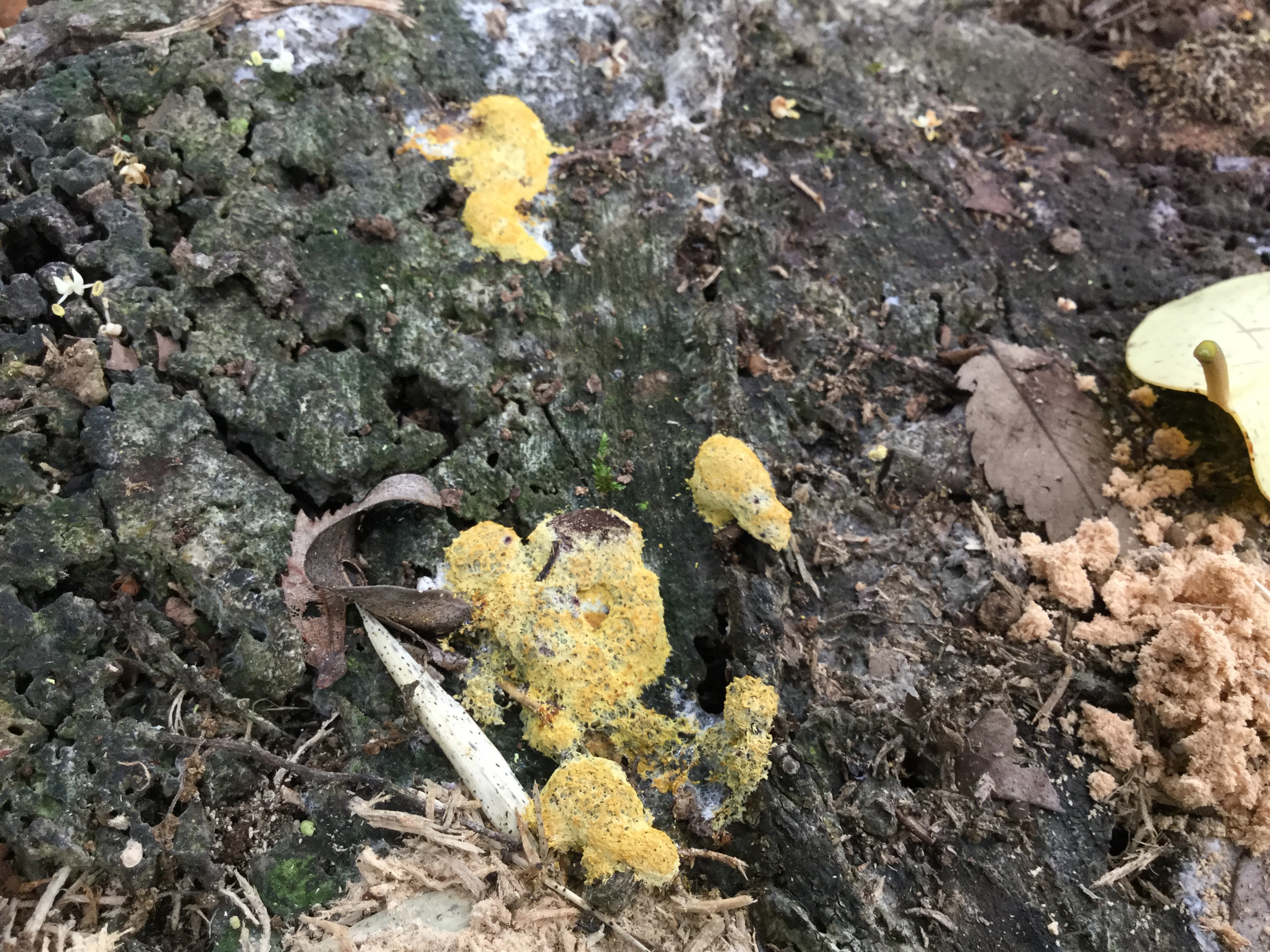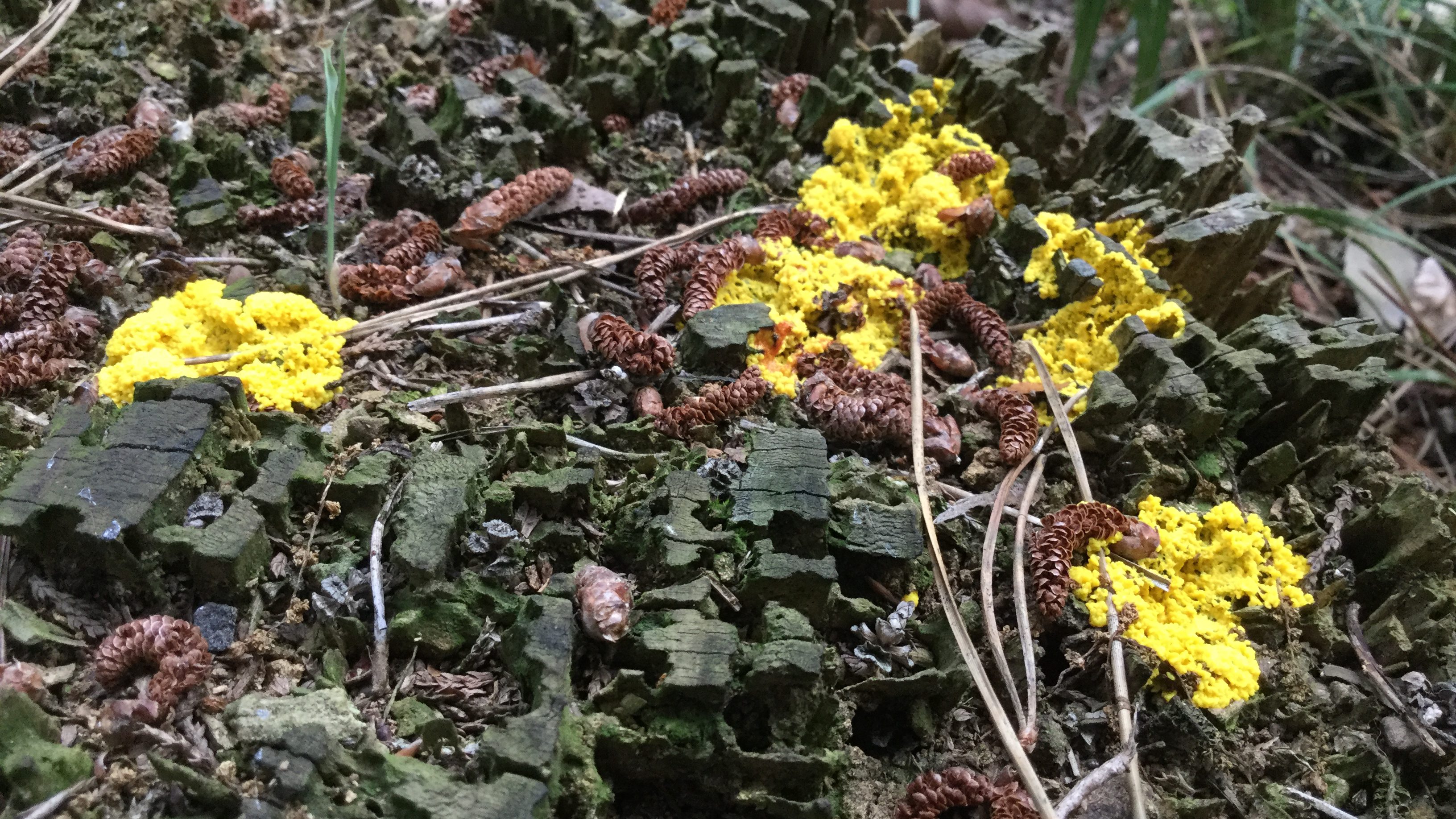 実は、最初に見つけたときはすごい色のきのこだとしか思わずスルーしました。その後で菌友から粘菌のことを教わり、改めて探してみたものの、子実体になってしまった後のものばかり見つける日々が続きました。左の写真では、指で触ったところだけ黄色い表面が剥がれて茶色の胞子が見えています。