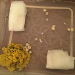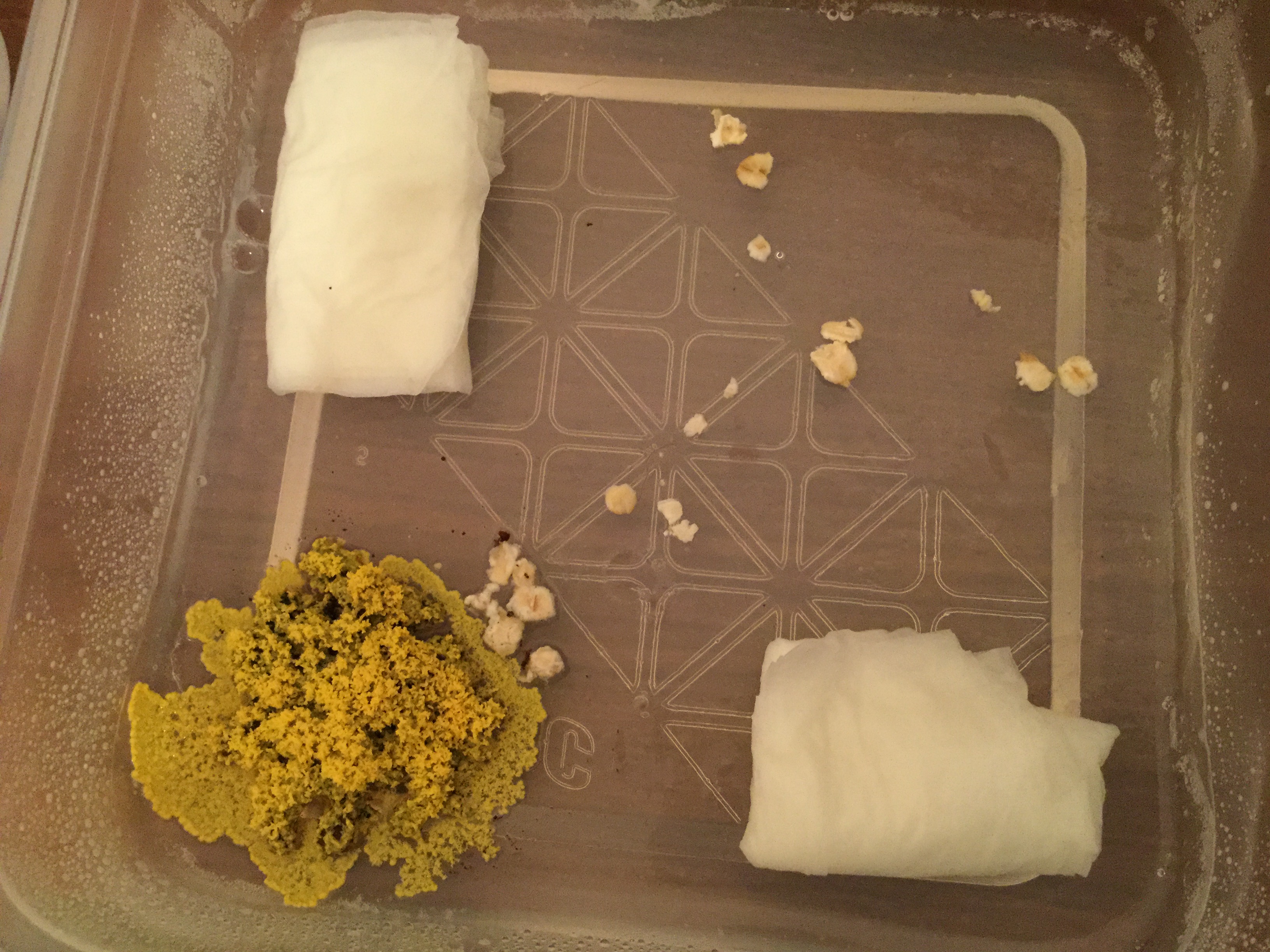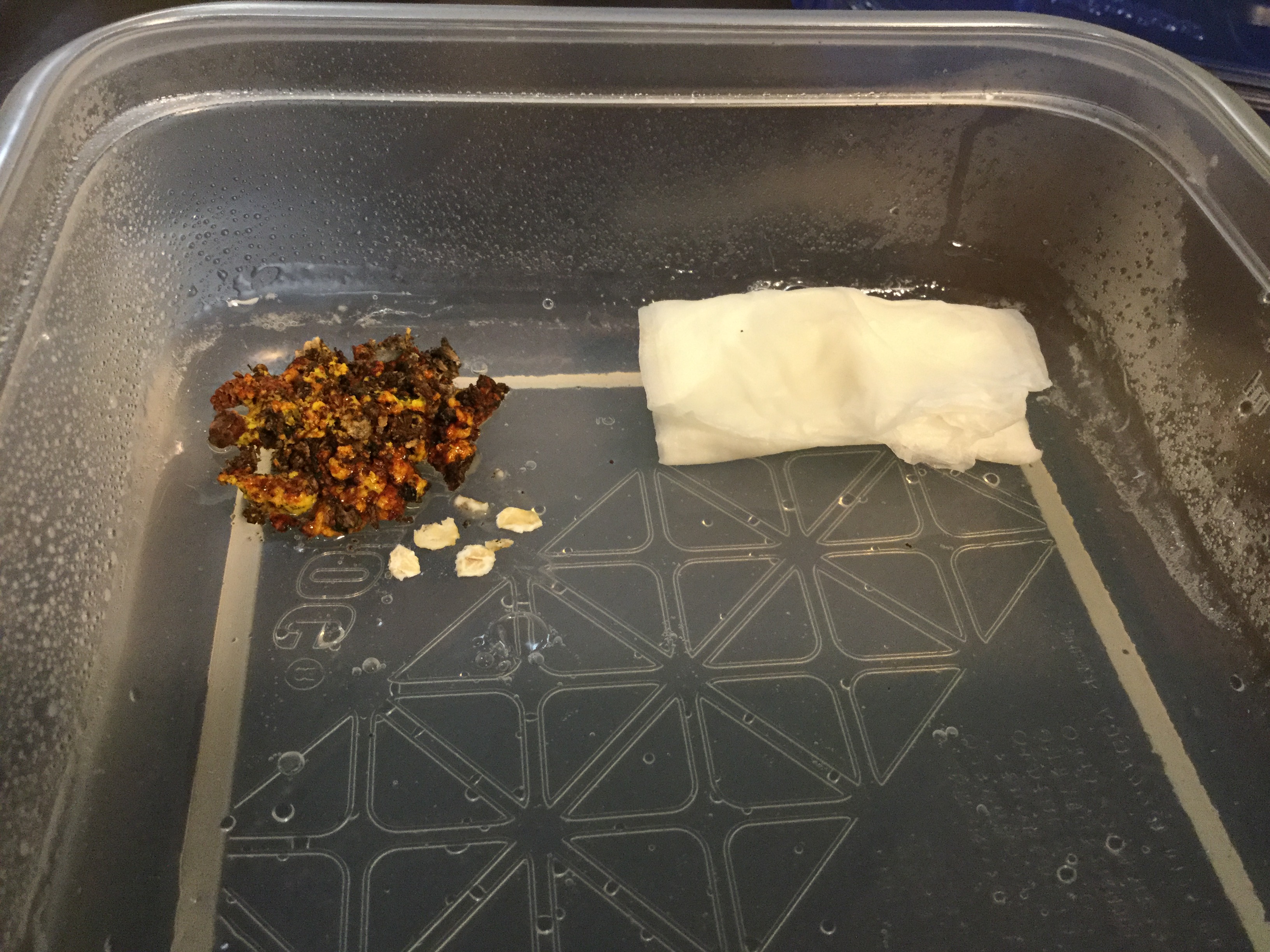 そうこうするうち一週間が経ち、保湿のために入れていたティッシュに変形体がたくさん取りついたので、新しい培地に移すことにしました。
