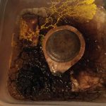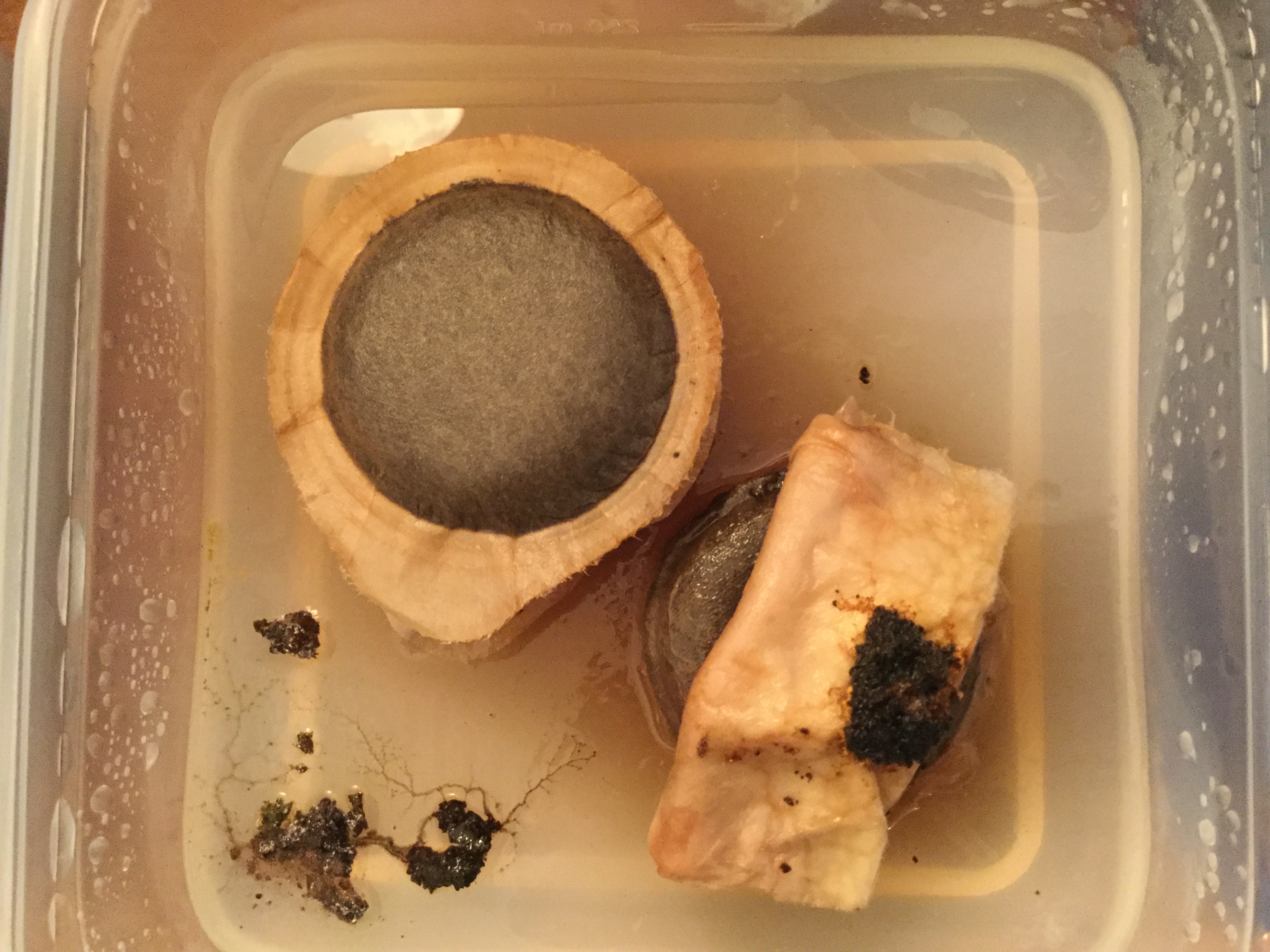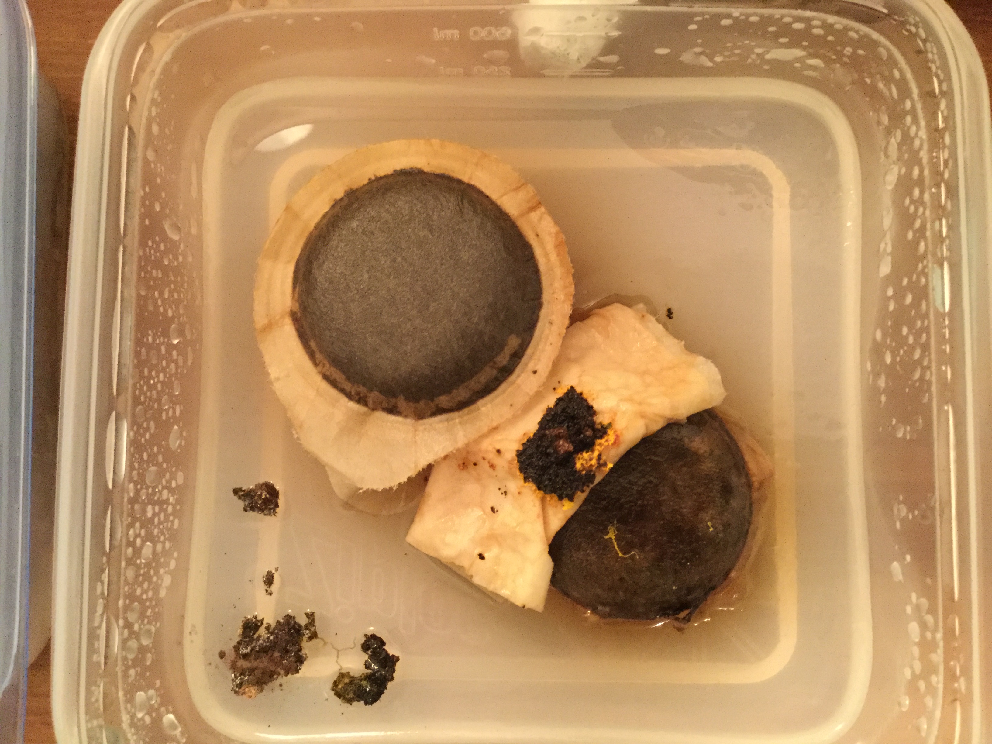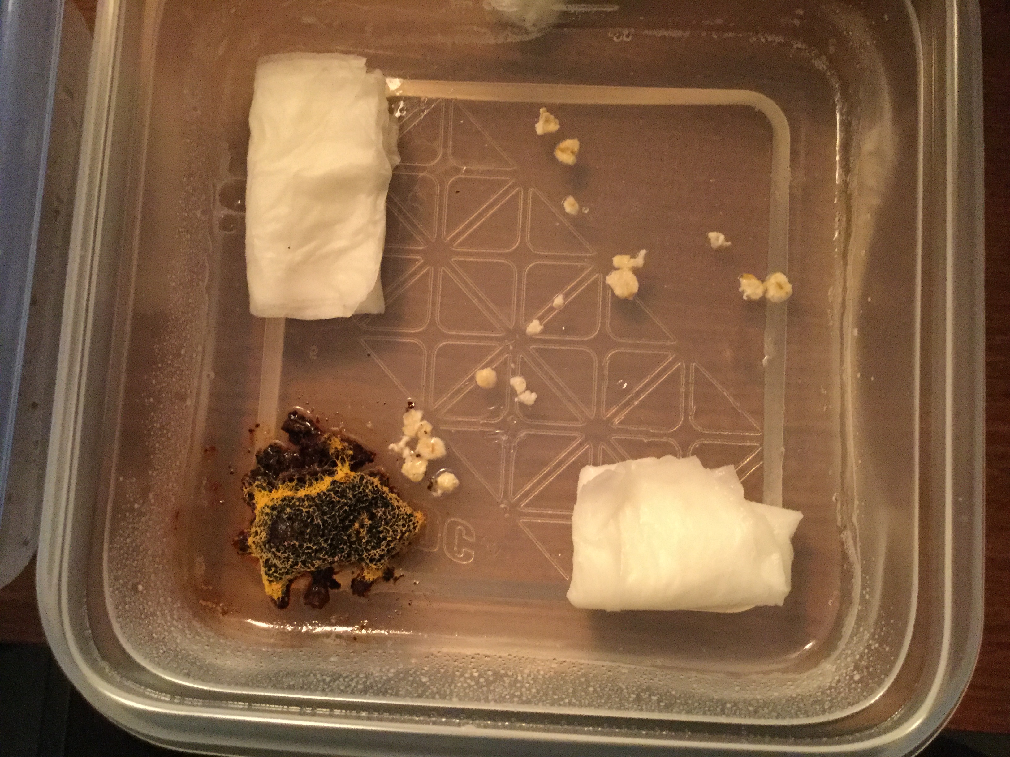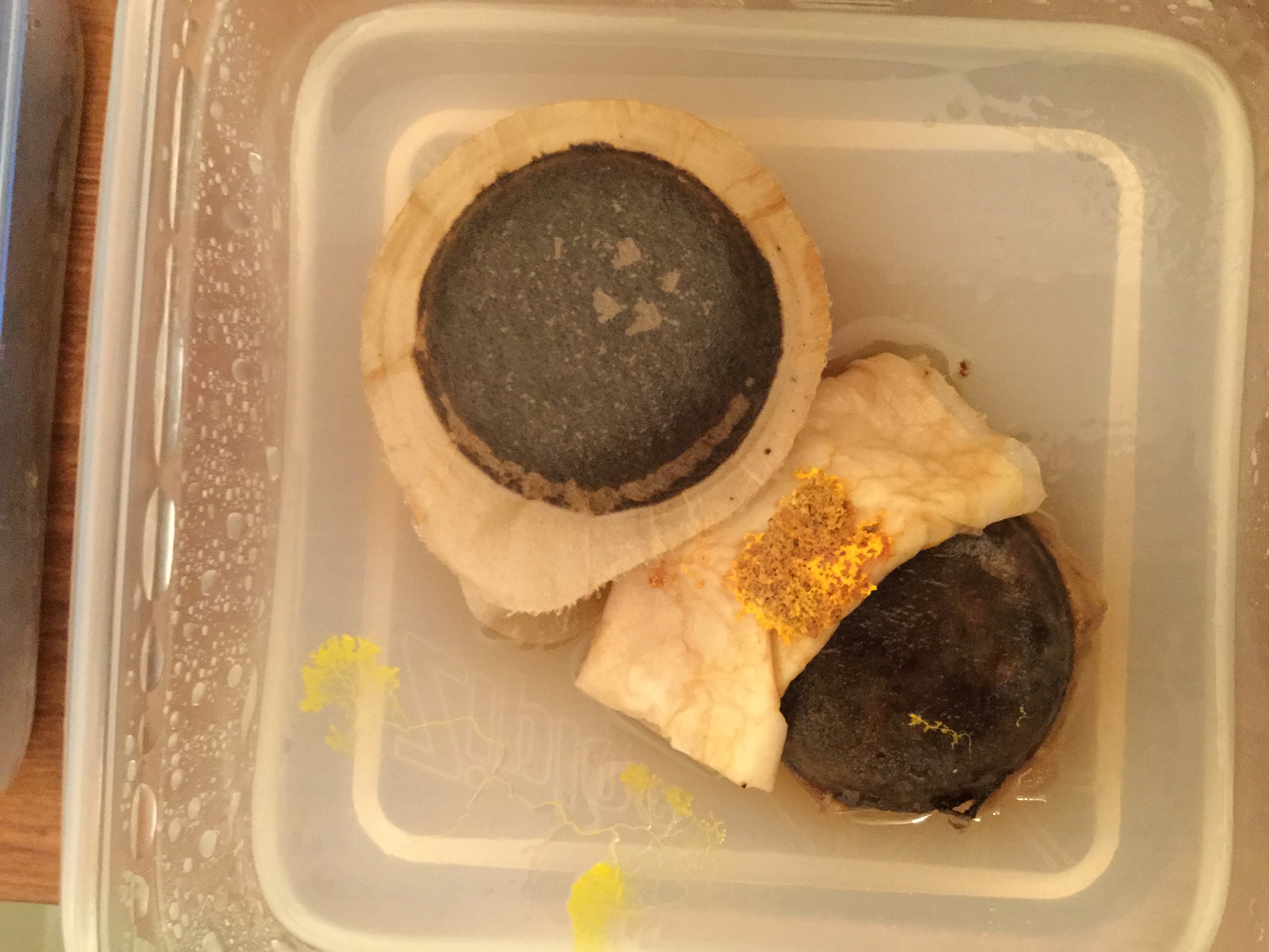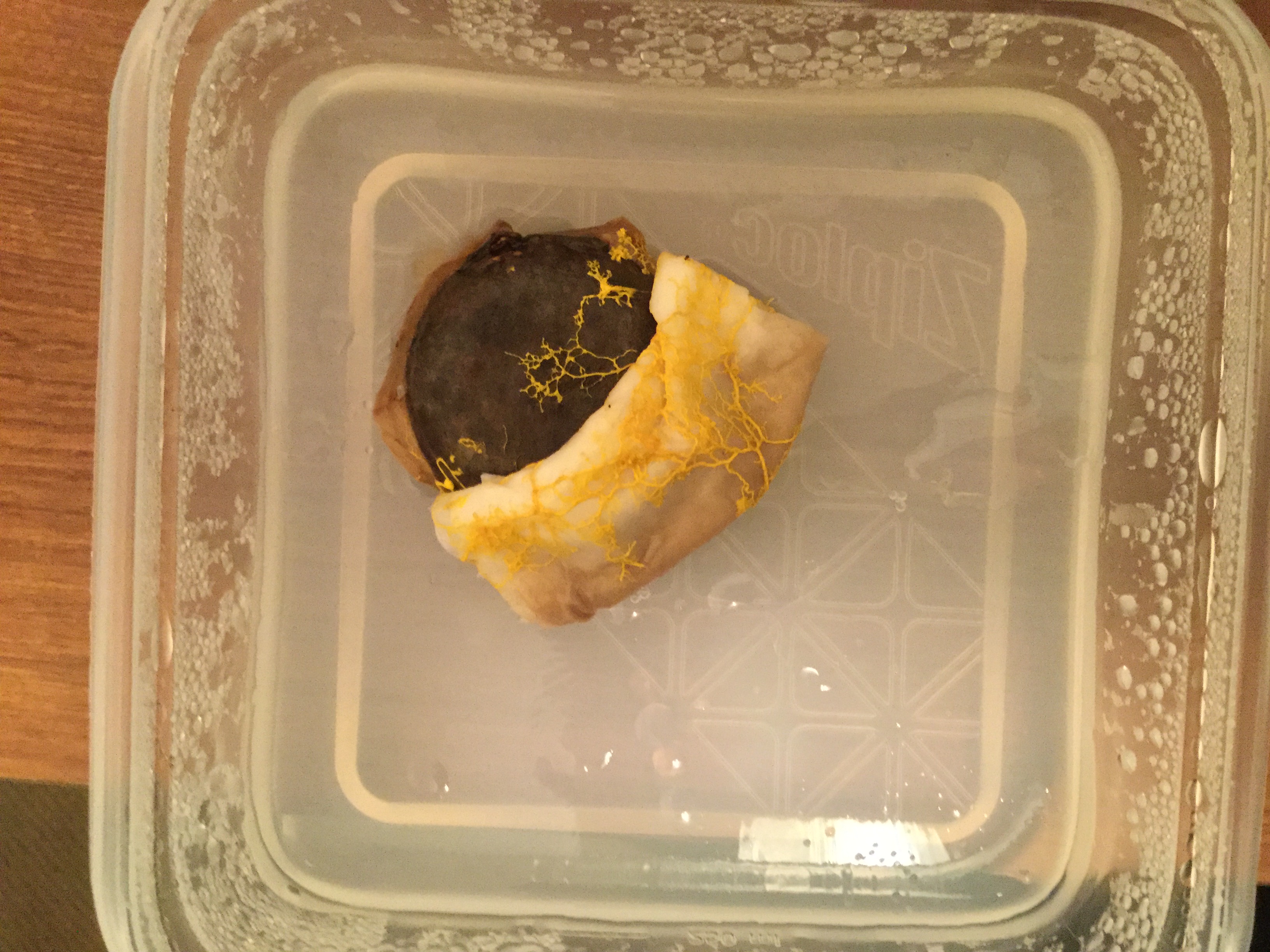変色が始まってから餌となるカビを与えた(写真中、培地上の黒い塊)のですが間に合わず、こうして、紆余曲折を経た粘菌培養は失敗したのでした。