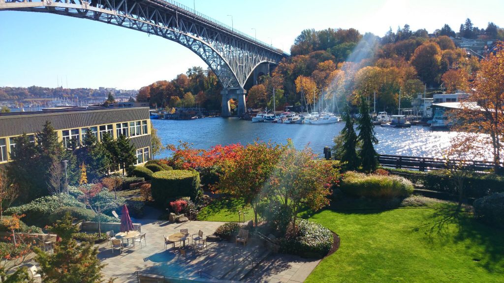 というわけで、研究留学 Advent Calendar 2017にかこつけて、よかったこと…だけでなく、こういうのはやめたほうがいいよ!という失敗談を提供したいと思います。下の写真は Adobe Research Seattle の中庭です。橋のたもとで水と緑、日差しに恵まれたすばらしい景色ですね。うらやましいですか?…最後まで読んでみてから、ご判断ください。