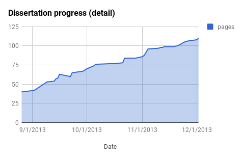 9 月になってくると Adobe インターンのほうは方針が固まってきました。興味があり、なおかつ勉強したいと思っていた分野のテーマになり、とてもいい滑り出しでした。一方で、博論ページ数の伸び悩みに苦しむようになります。博論の章立てなど骨組みは決まっていたので、進捗を可視化するために以下のようなグラフを半自動で生成できるようにしていました。