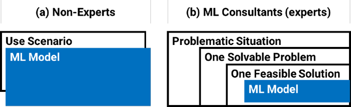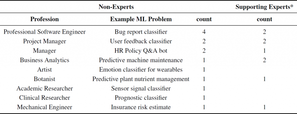 対面での調査対象は上記のとおり素人 14 名(Non-Experts; データサイエンスや統計などの学位を持たず必要に応じて機械学習を利用した問題解決を行っている人)と、雇われてその人たちを助けているプロ 10 名(Supporting Experts)です。さらに、オンラインで素人 98 名のデータを集めています。ここで気をつけたいのは、素人といってもプログラミングができないわけではないというところです。ふつうにコードは書けるけど、機械学習の専門的教育は受けていない人たちですね。