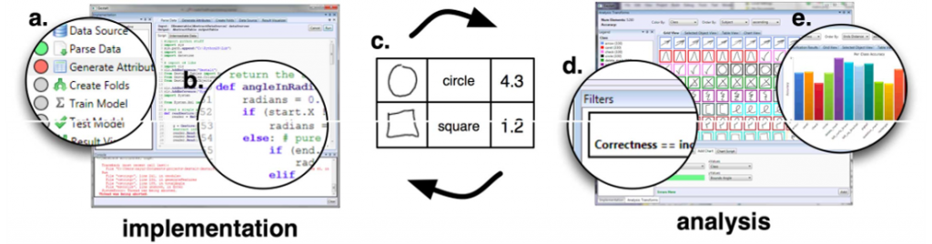 基本的なアイデアは、機械学習アルゴリズムの開発では実装と分析を行ったり来たりするので、その各ステップに適したユーザインタフェースのセットを定義し、それが全部入った統合開発環境があればいいでしょう、というものです。
