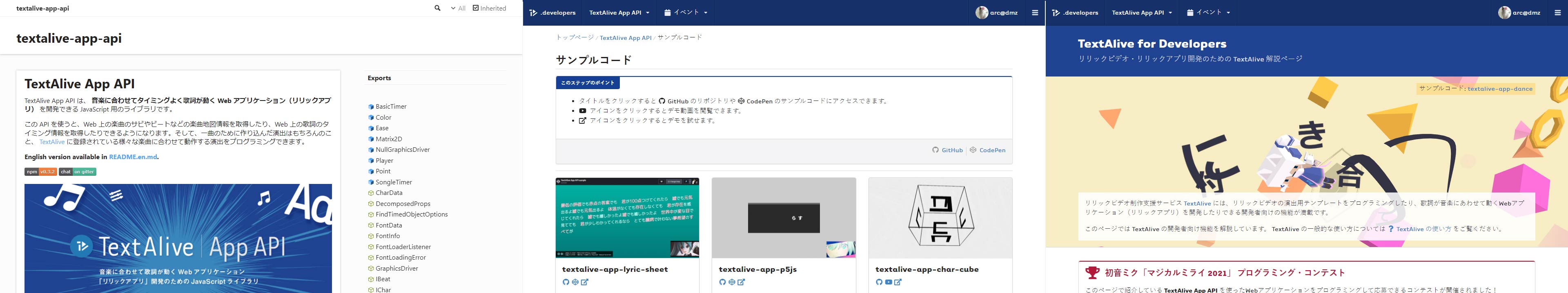 サンプルコードは GitHub 上の AIST TextAlive Project に集約しているほか、チュートリアル内のサンプルコードのページやプログラミング・コンテストのアフターレポート(2020・2021)冒頭から、サムネイルつきでアクセスしやすいようにしています。チュートリアルは TextAlive for Developers という Web サイトを開設しています。ちなみに、私はチュートリアルから実際のアプリ開発に移るときのギャップを小さくする研究にも取り組んでいたのですが( DeployGround; Songle Sync チュートリアル に実装済み)、TextAlive に関してはそこまで手が回っていません。