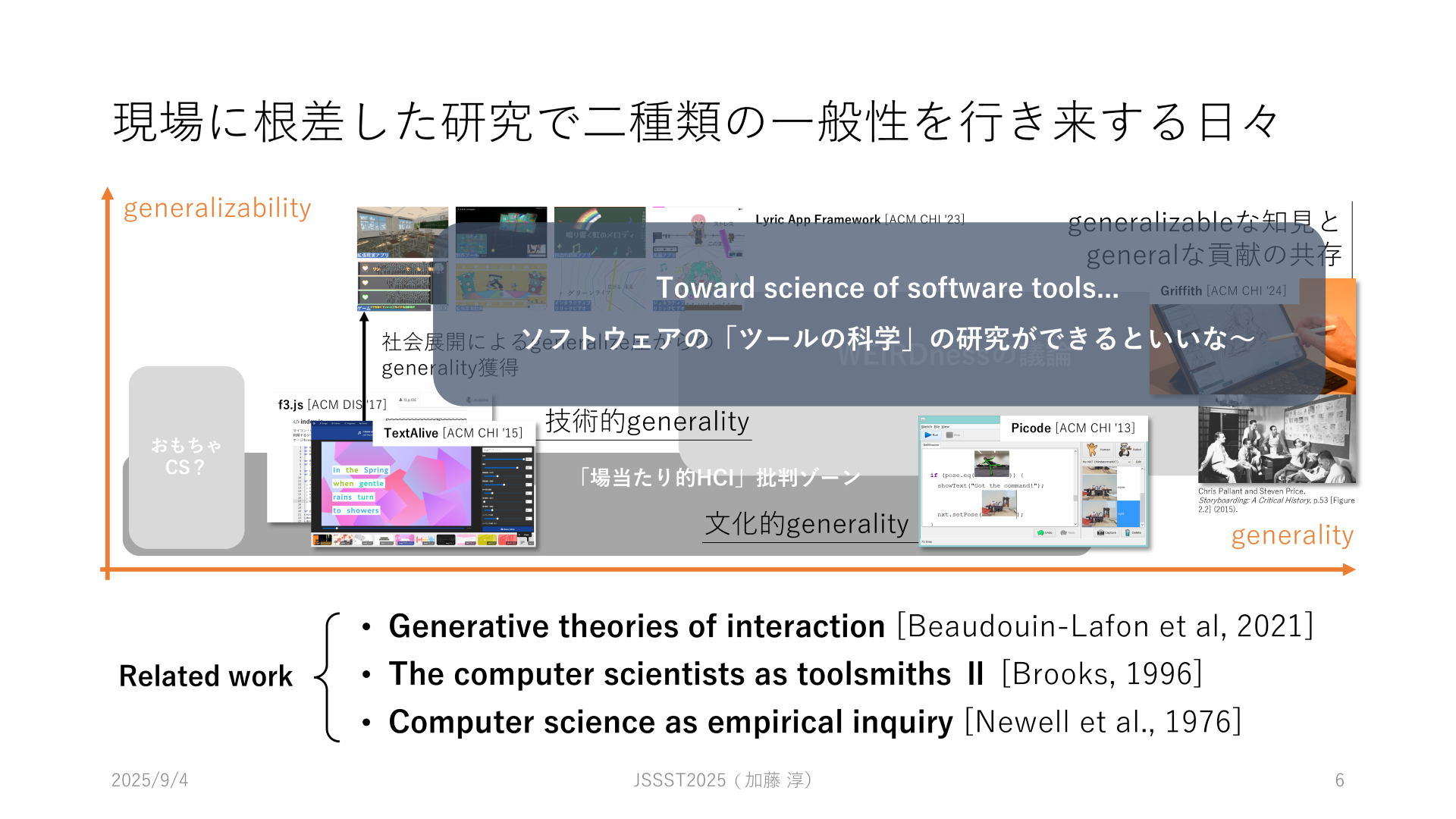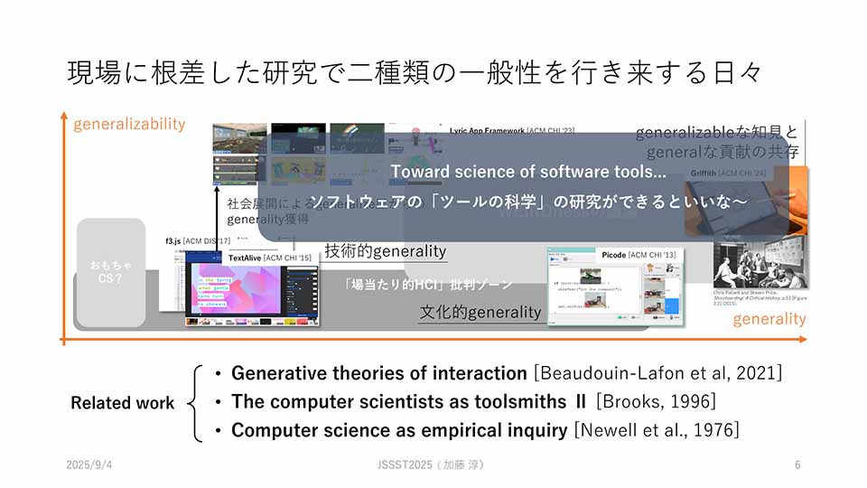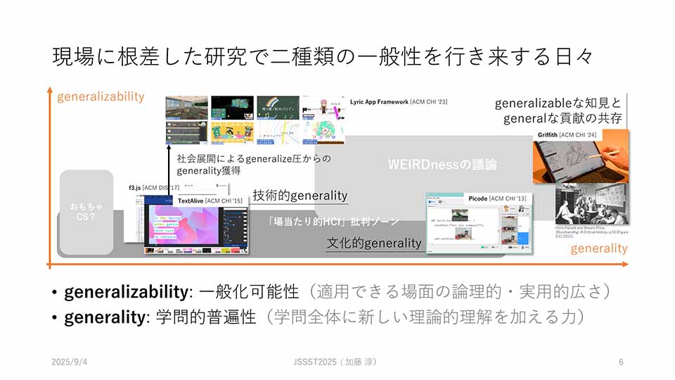 ここで、もう一種類の一般性、generality は仮に学問的普遍性と訳しています。半分、昨年度の研究パートナー Michel Beaudouin-Lafon の受け売りですが、コンピュータ科学は、現象を理論立てて理解可能にする研究をもっと重視したほうがいいように感じています。