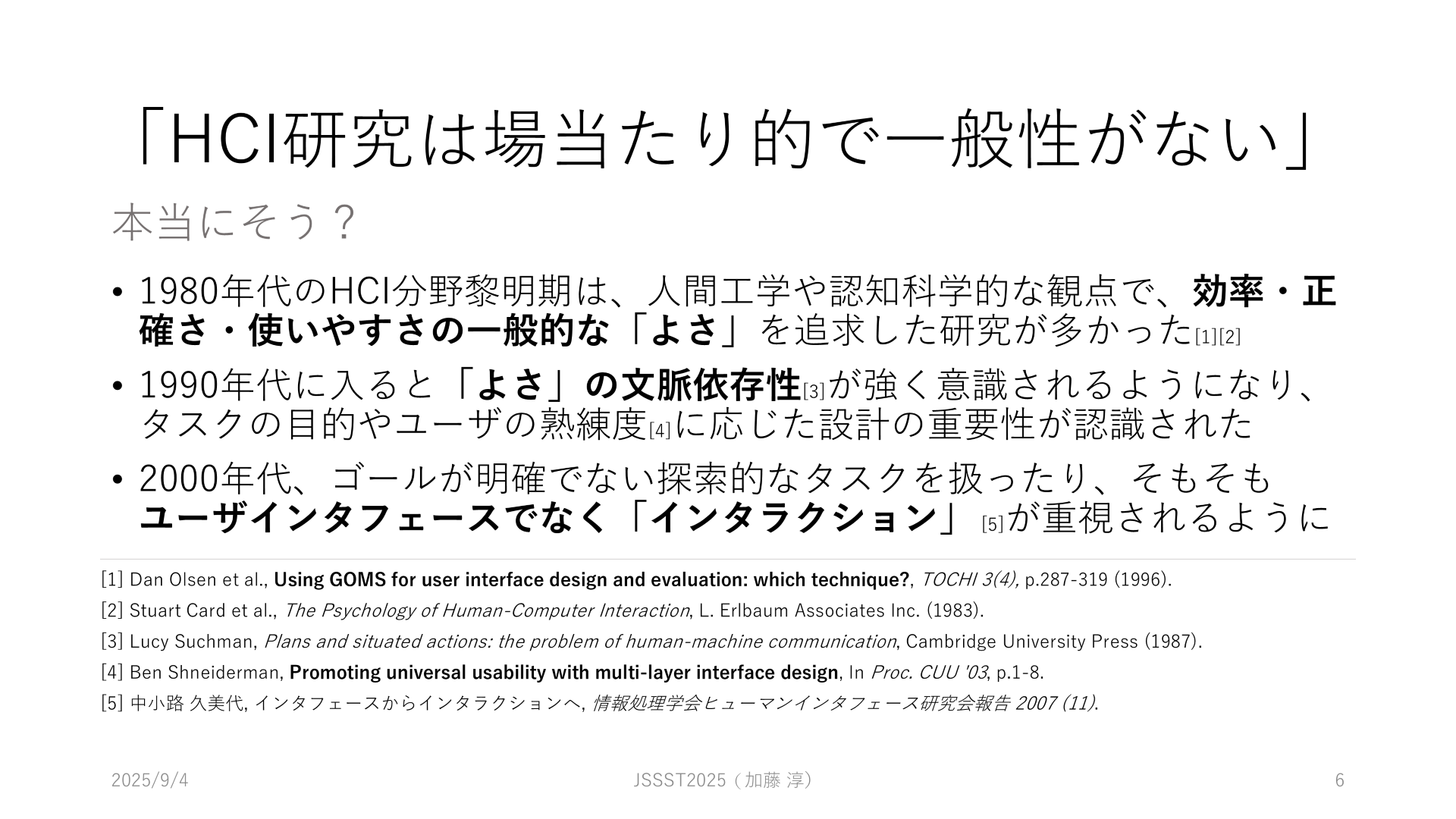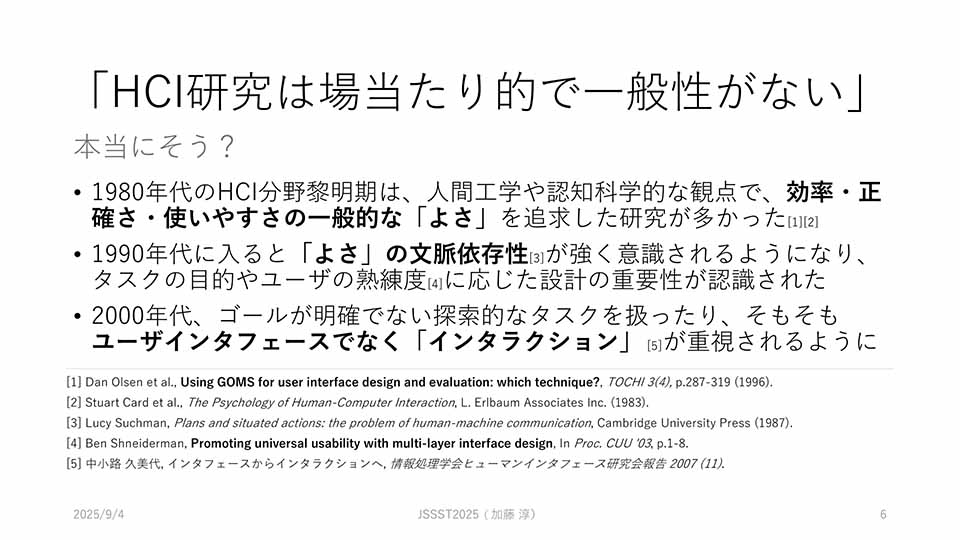これまでに私が取り組んできた研究のなかでも「よい研究」と思っている自信作を紹介し、自分が思う「よさ」の源として、二種類の一般性(generalizability, generality)について議論しました。Human-Computer Interaction 研究はしばしば、場当たり的で generalizability(一般化可能性)が欠けているとして批判されます。本講演はそれへのアンサーでもあります。