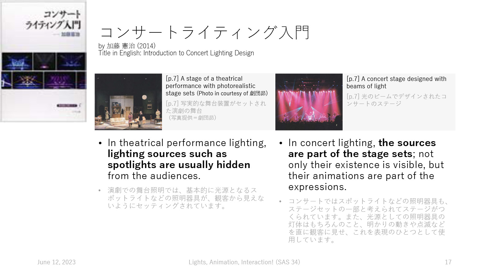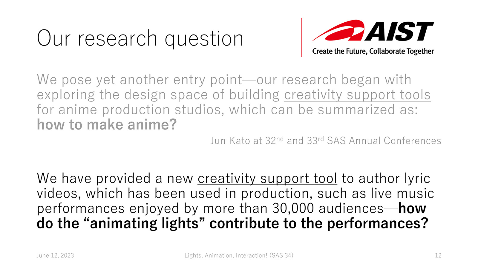 Considering my experience in the primary affiliation, AIST TextAlive Project, helping live musical performances on the physical/virtual stages, I switched the topic this year: how do the "animating lights" contribute to the stage performances? The slides are already available online.