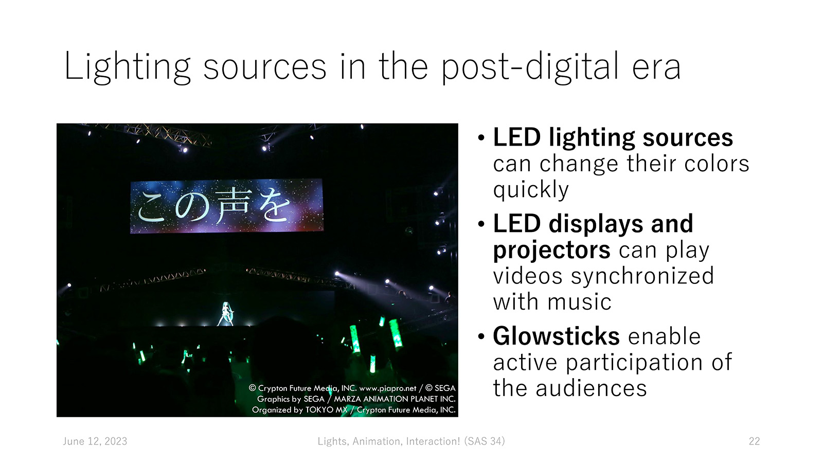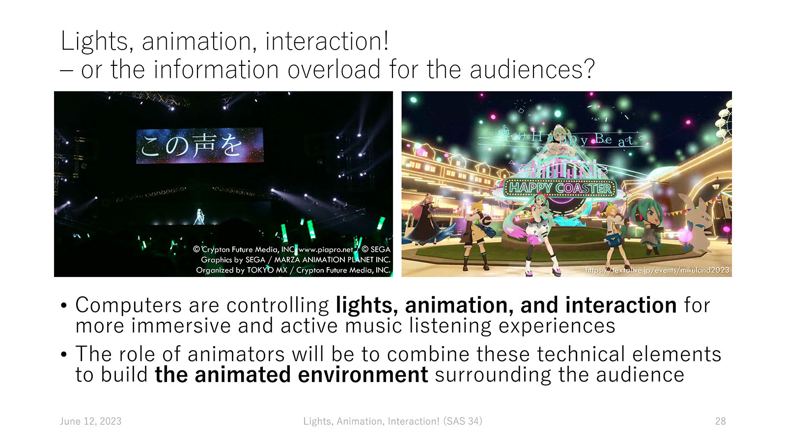 In my talk, I revealed the rich design space of "animating lights" for live music performances with concrete examples of lighting mechanisms, the brief history of related technologies enabling such an "animated environment," and the potential information overload caused by the computer-controlled lighting. The role of "animators" in this context is to combine various technical elements to design an immersive and active music listening experience for the audience with an appropriate amount of information.