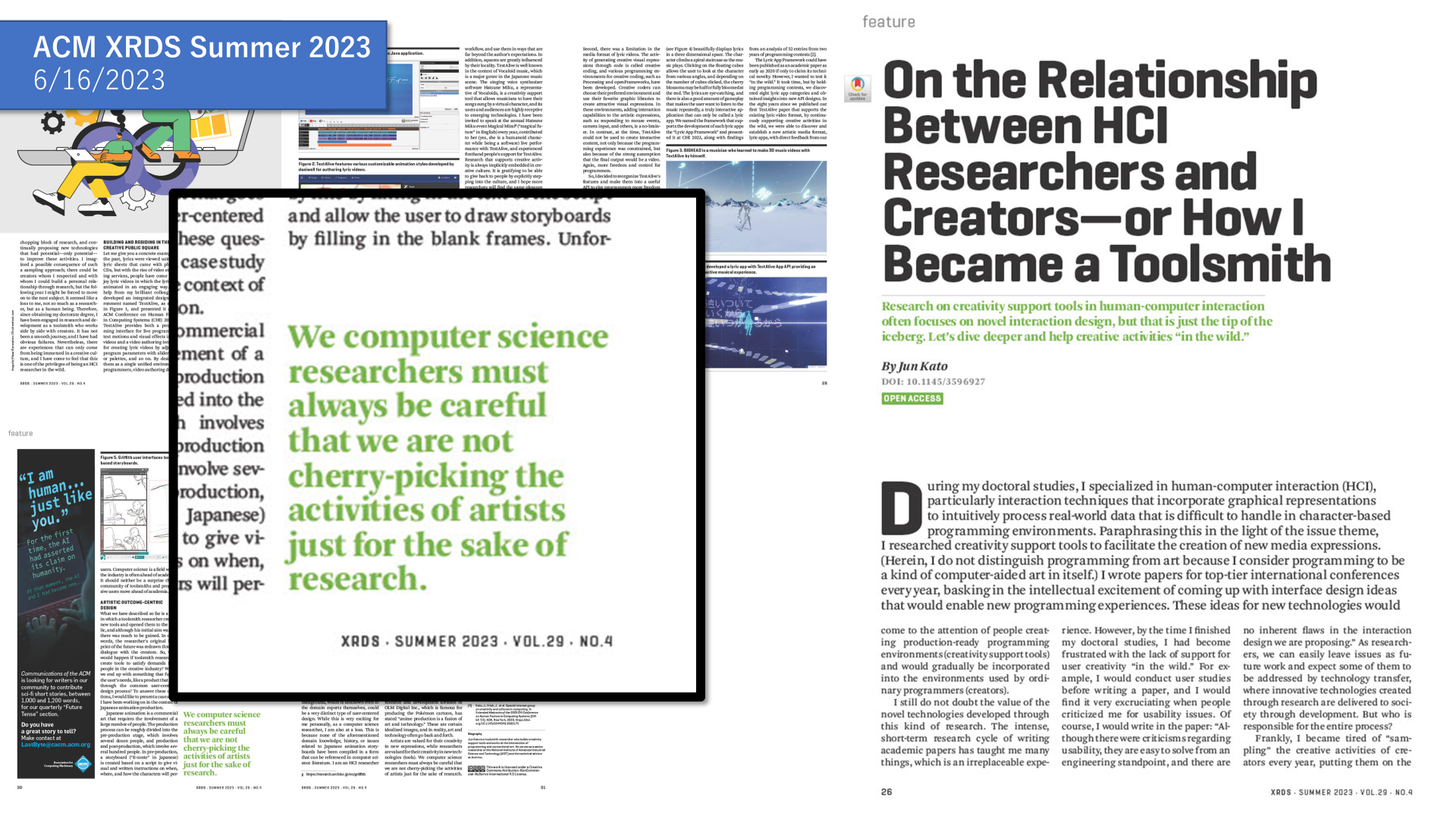 My XRDS article touches on these issues by introducing my experience helping musicians, programmers, and anime directors. It highlights two case studies: TextAlive, developing an AI-enabled environment for authoring and distributing lyric videos and lyric apps, and Griffith, developing a storyboarding tool.